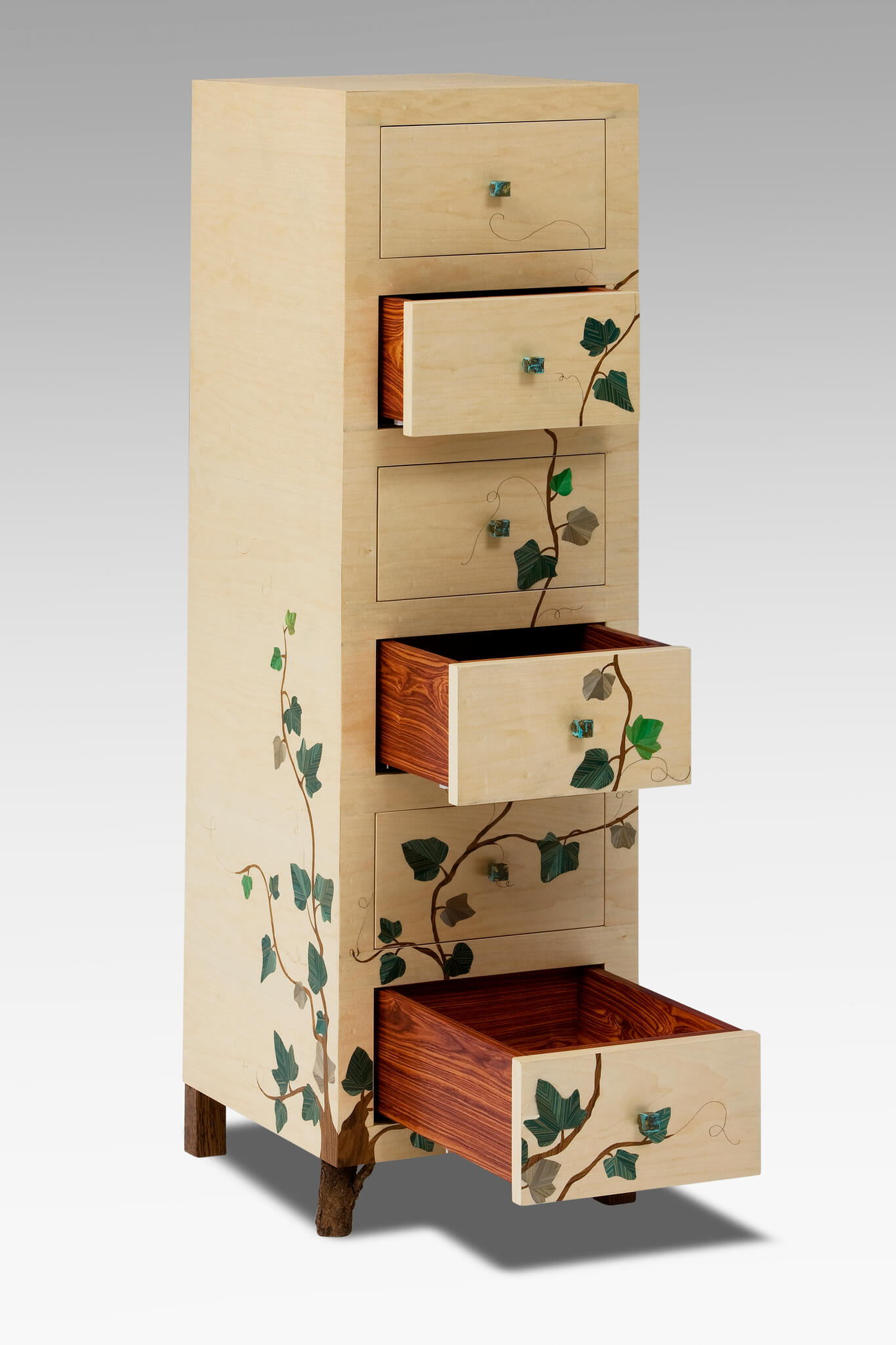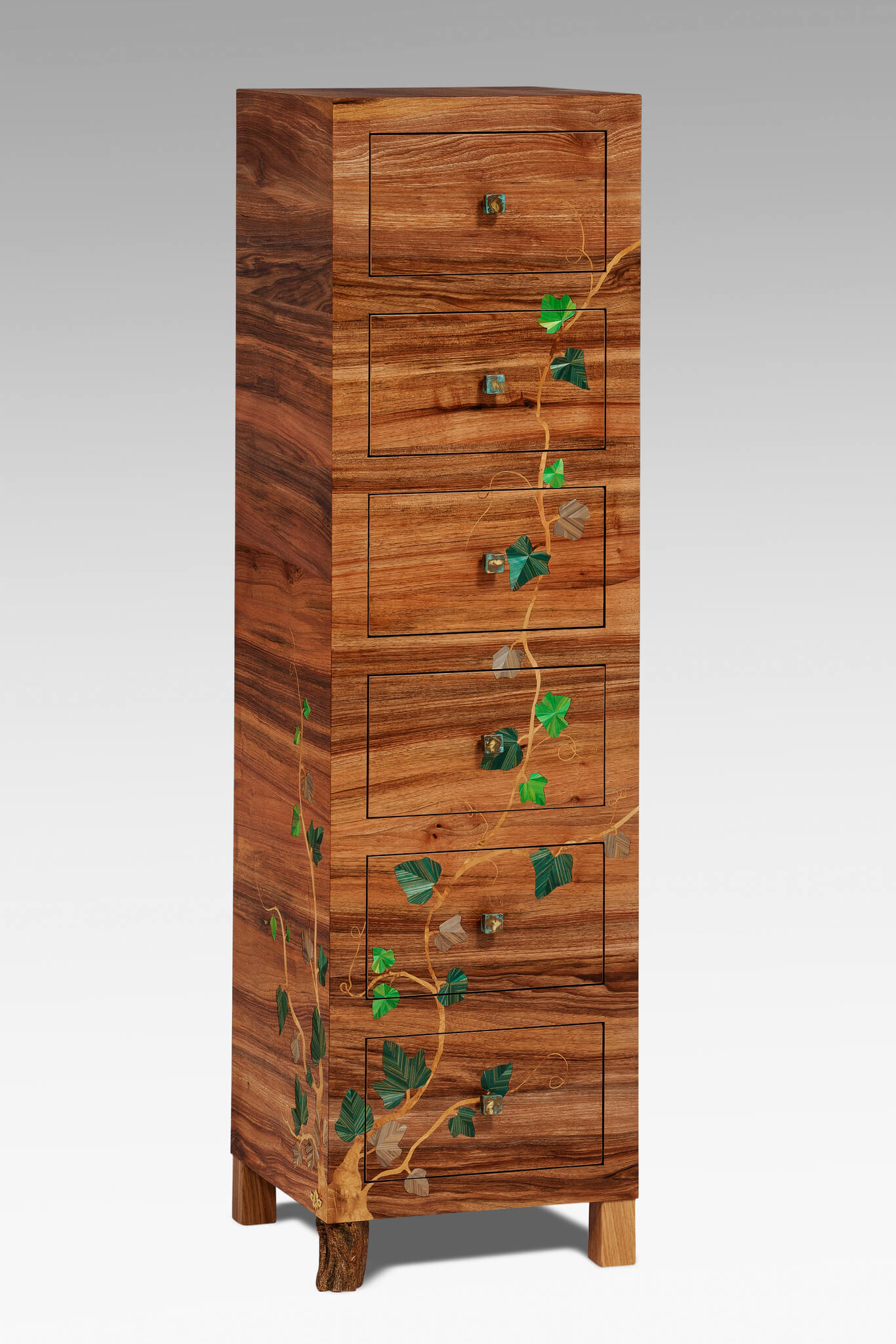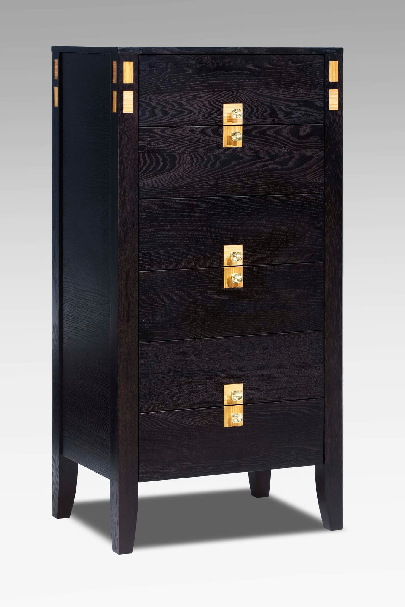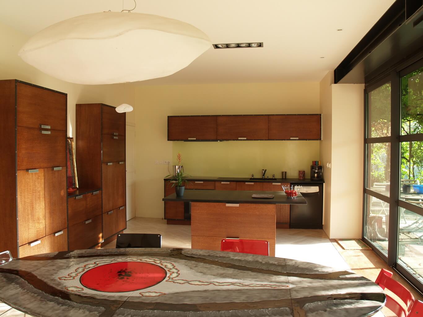 L’ébénisterie ne s’arrête pas à la sélection des essences et au travail du bois. Amaryllis intègre également du métal, du verre, du marbre…